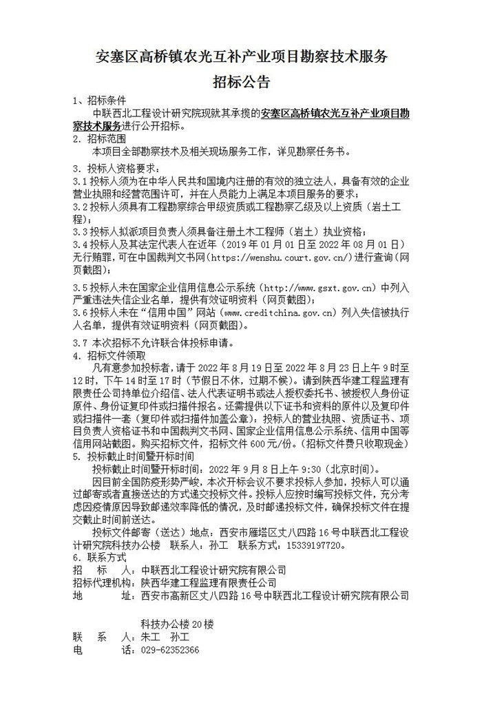 安塞区高桥镇农光互补产业项目勘察技术服务招标公告