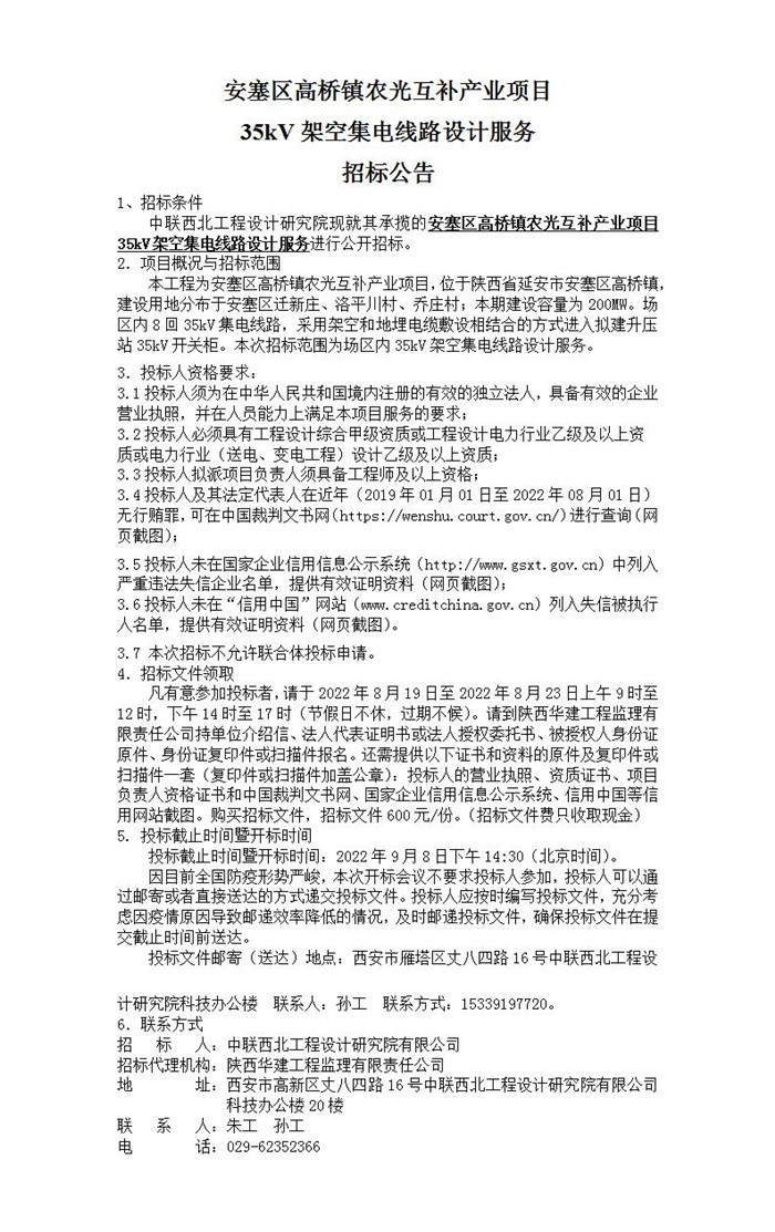 安塞区高桥镇农光互补产业项目35kV架空集电线路设计服务招标公告