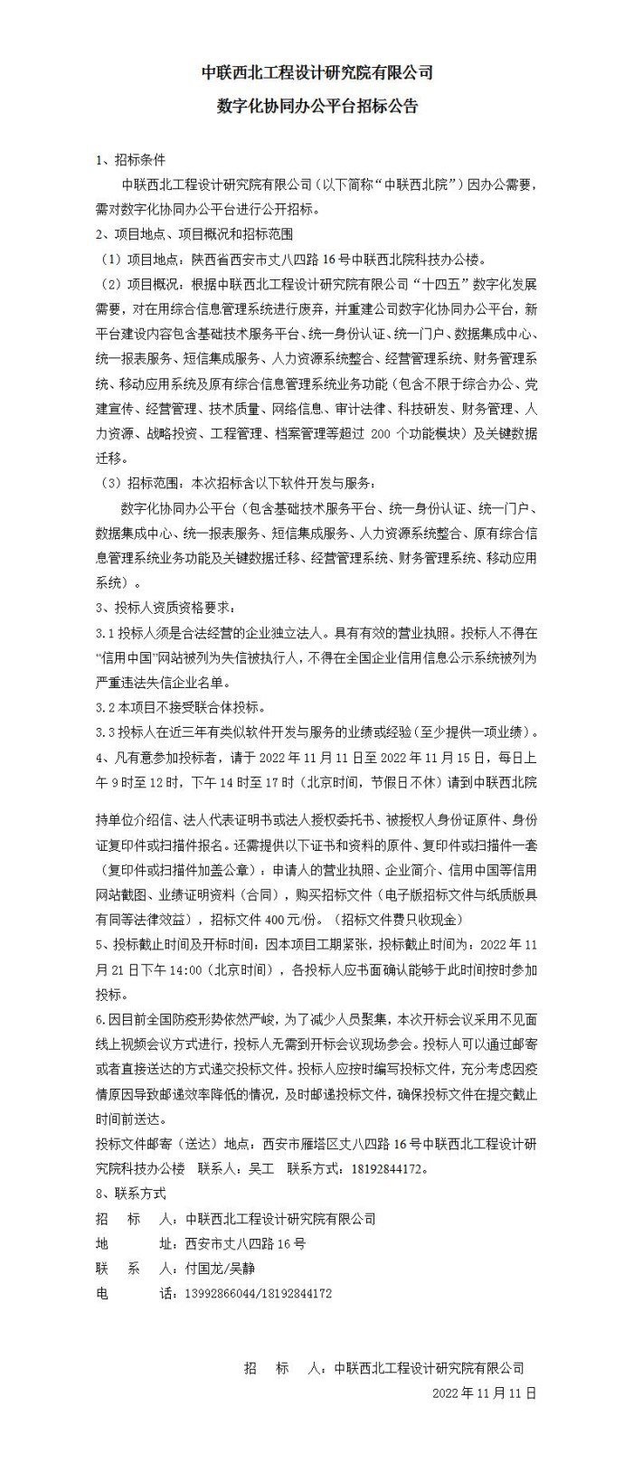 中联西北工程设计研究院有限公司数字化协同办公平台招标公告