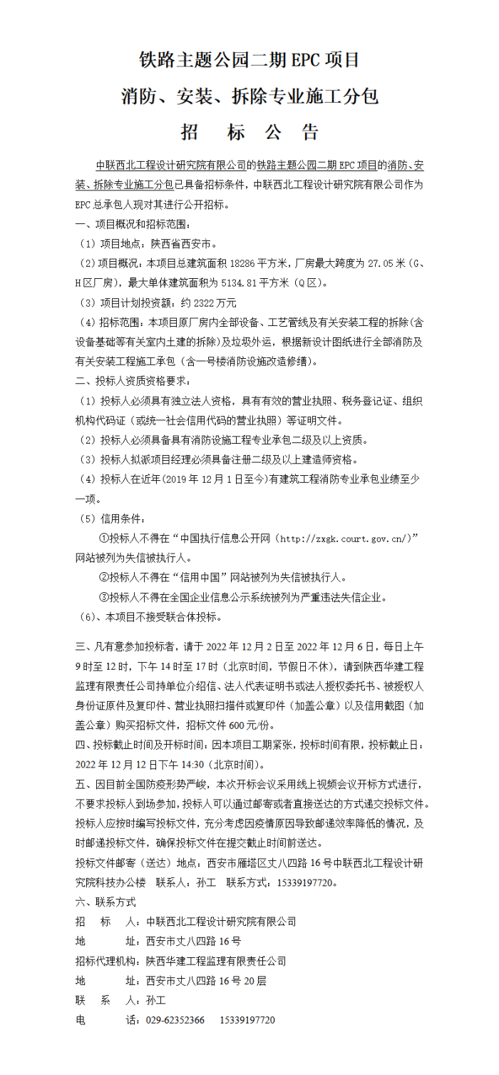 铁路主题公园二期EPC项目消防、安装、拆除专业施工分包招标公告