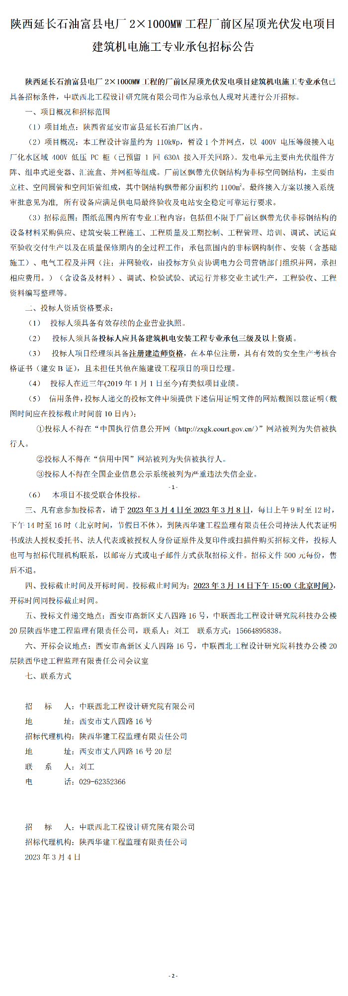 陕西延长石油富县电厂2×1000MW工程厂前区屋顶光伏发电项目建筑机电施工专业承包招标公告