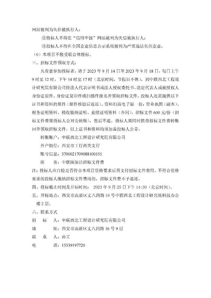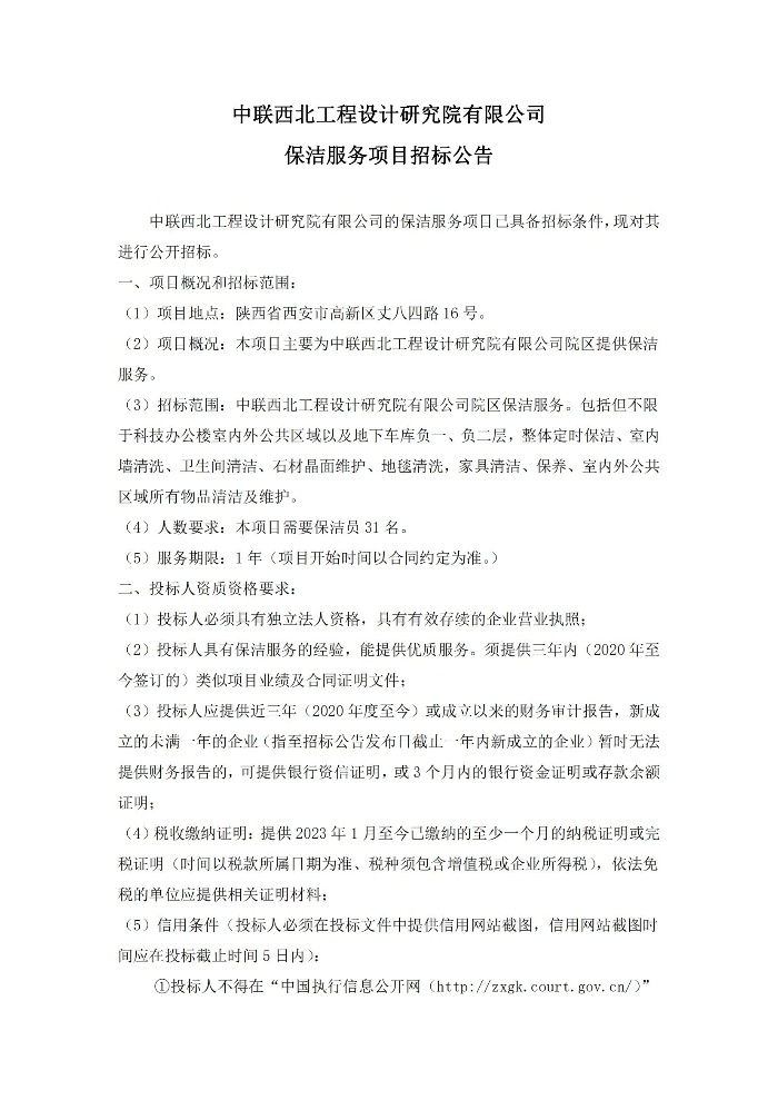中联西北工程设计研究院有限公司保洁服务项目招标公告