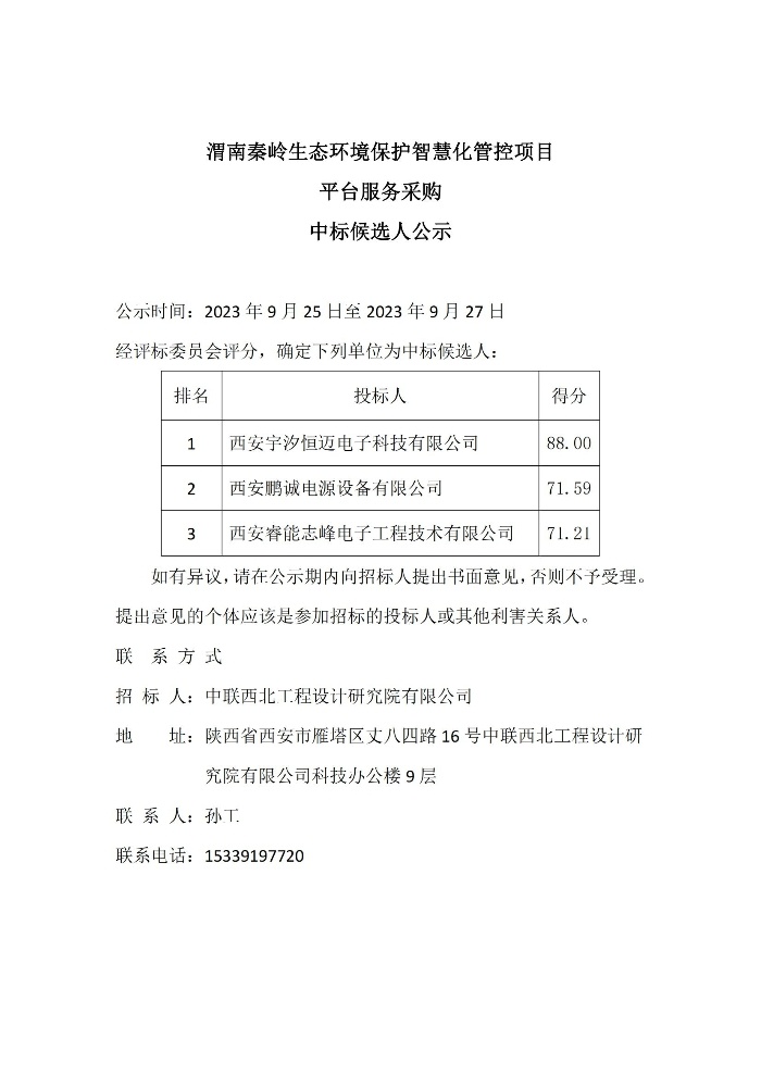 渭南秦岭生态环境保护智慧化管控项目平台服务采购中标候选人公示