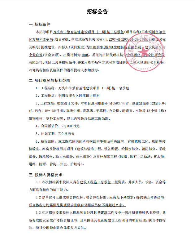 万头和牛繁育基地建设项目(一期)施工总承包招标公告