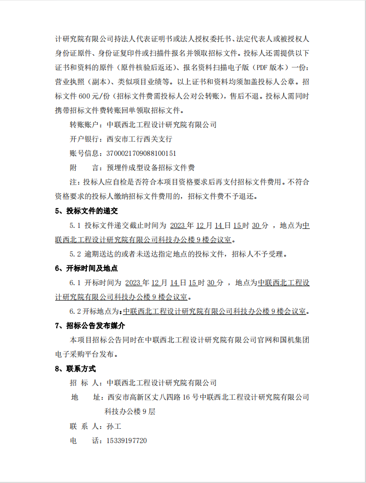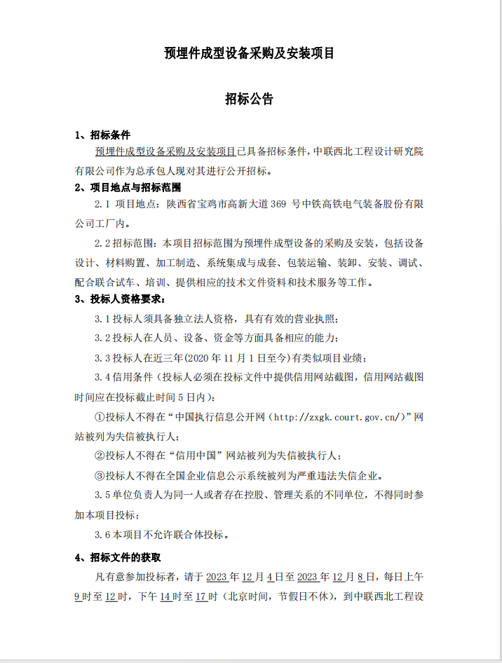 预埋件成型设备采购及安装项目招标公告