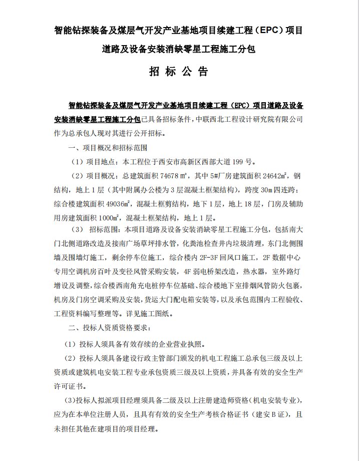 智能钻探装备及煤层气开发产业基地项目续建工程(EPC)项目道路及设备安装消缺零星工程施工分包