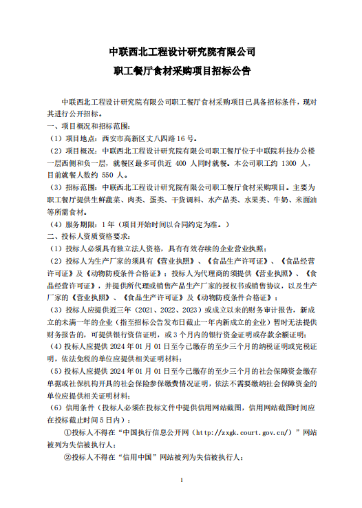 中联西北工程设计研究院有限公司职工餐厅食材采购项目招标公告