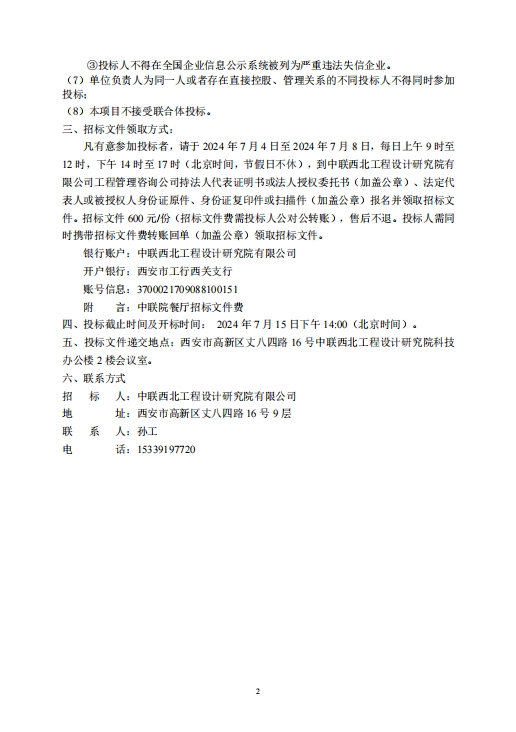 中联西北工程设计研究院有限公司职工餐厅劳务外包服务项目招标公告