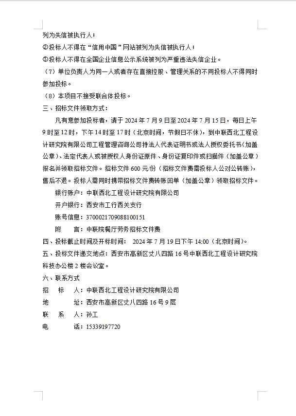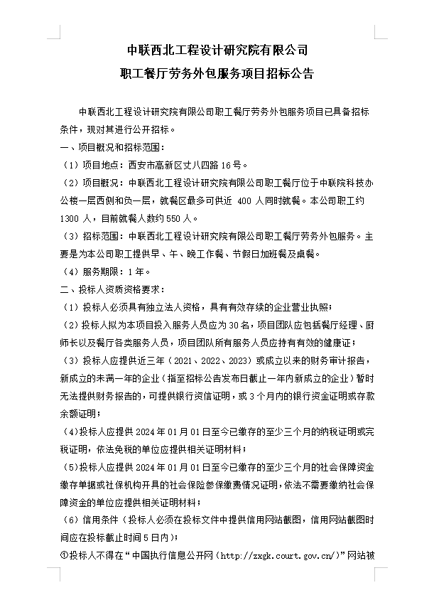 中联西北工程设计研究院有限公司职工餐厅劳务外包服务项目招标公告