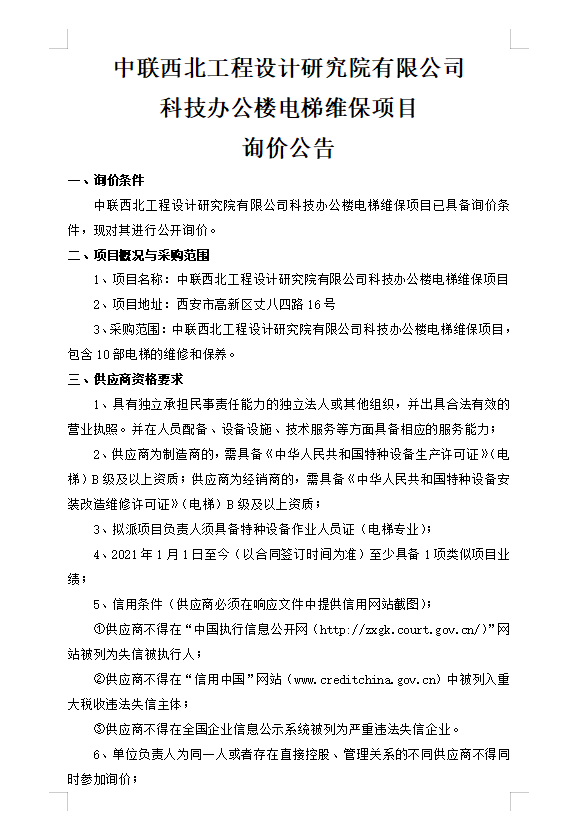 中联西北工程设计研究院有限公司科技办公楼电梯维保项目询价公告