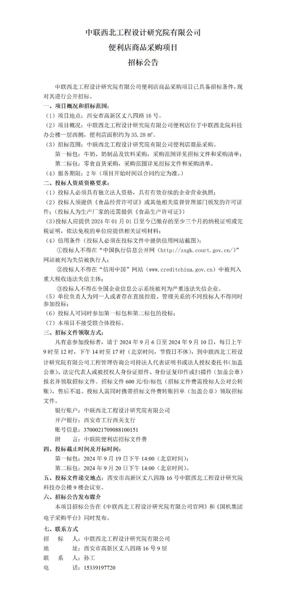 中联西北工程设计研究院有限公司便利店商品采购项目招标公告