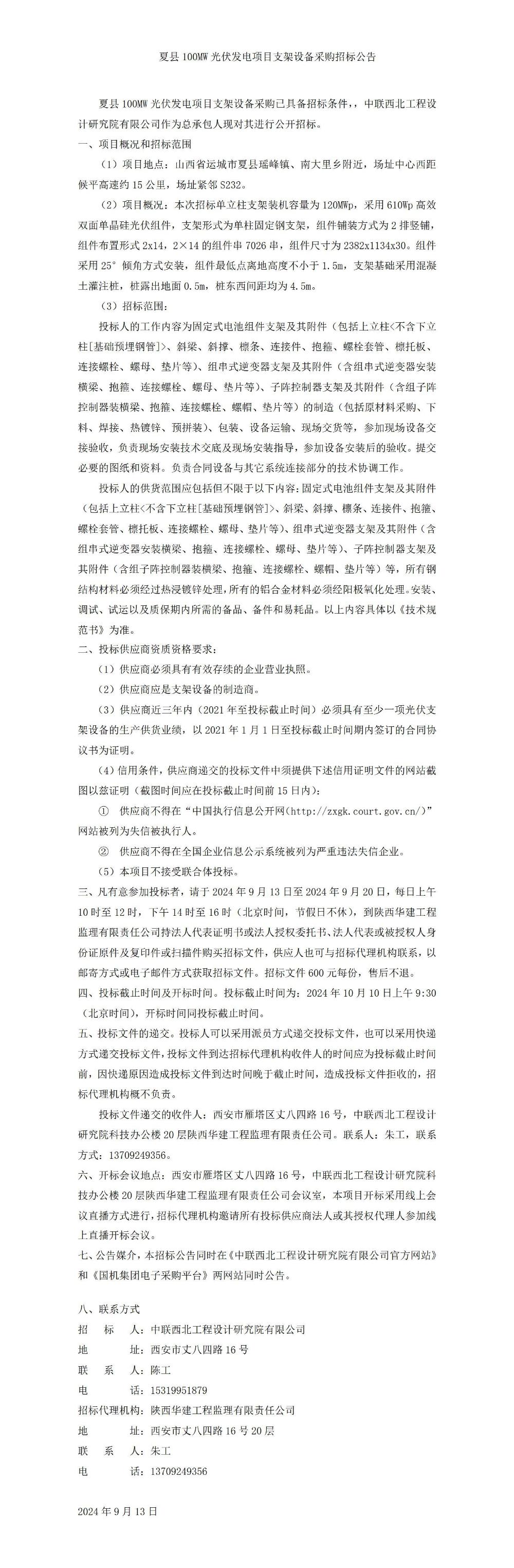 陕煤夏县100MW光伏发电项目支架采购招标公告