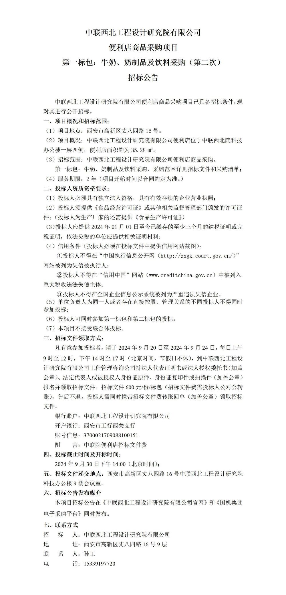 中联西北工程设计研究院有限公司便利店商品采购项目第一标包:牛奶、奶制品及饮料采购(第二次)招标公告