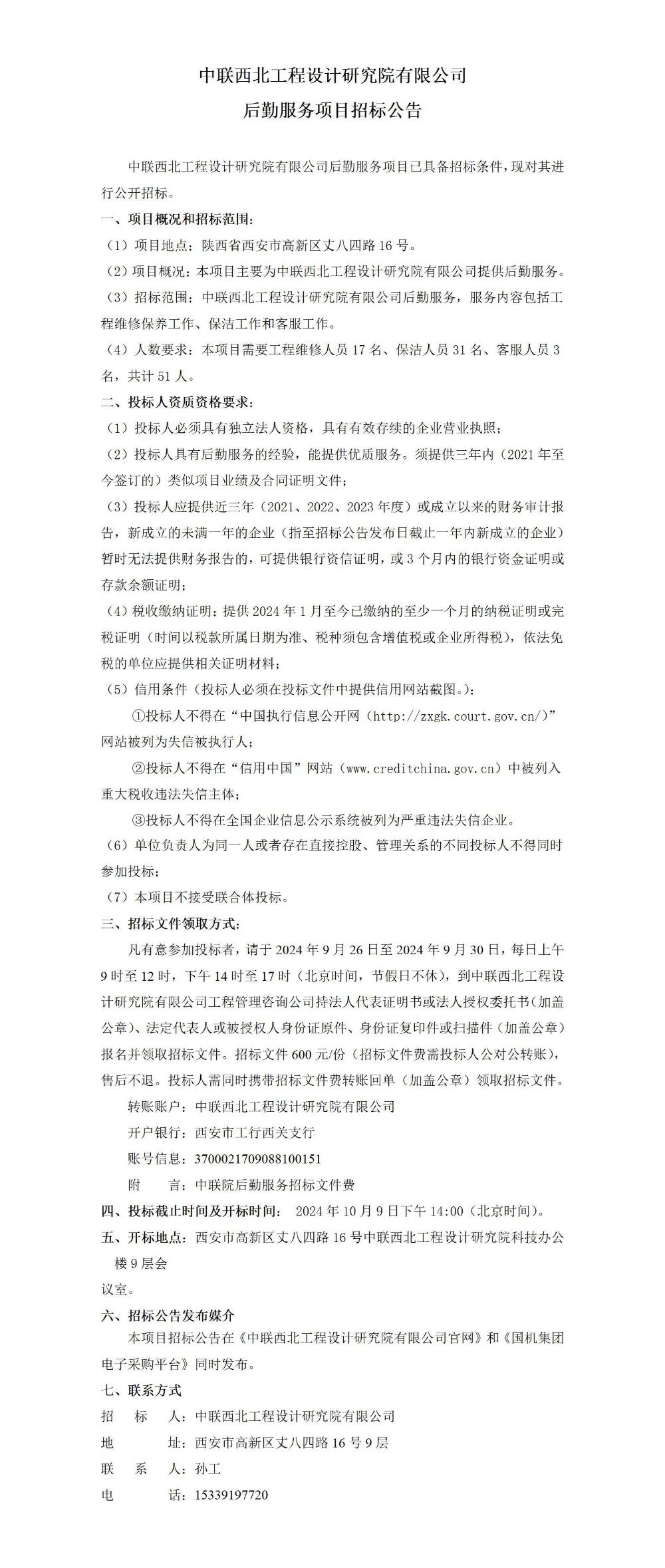 中联西北工程设计研究院有限公司后勤服务项目招标公告