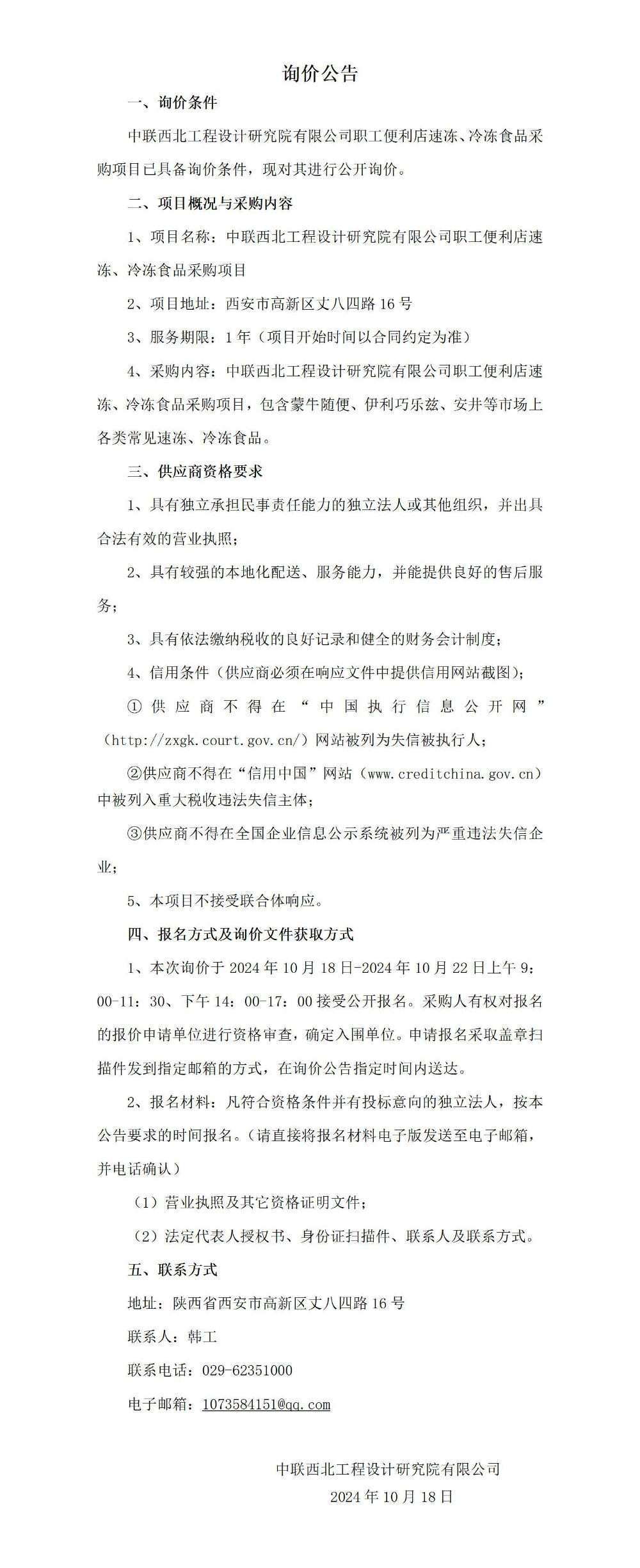 职工便利店速冻产品、冰淇淋采购项目询价公告