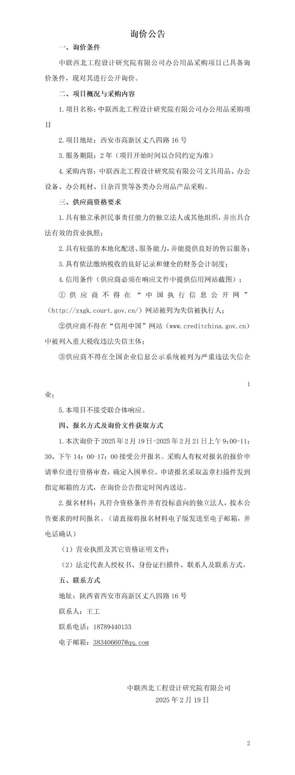 中联西北工程设计研究院有限公司办公用品采购项目询价公告