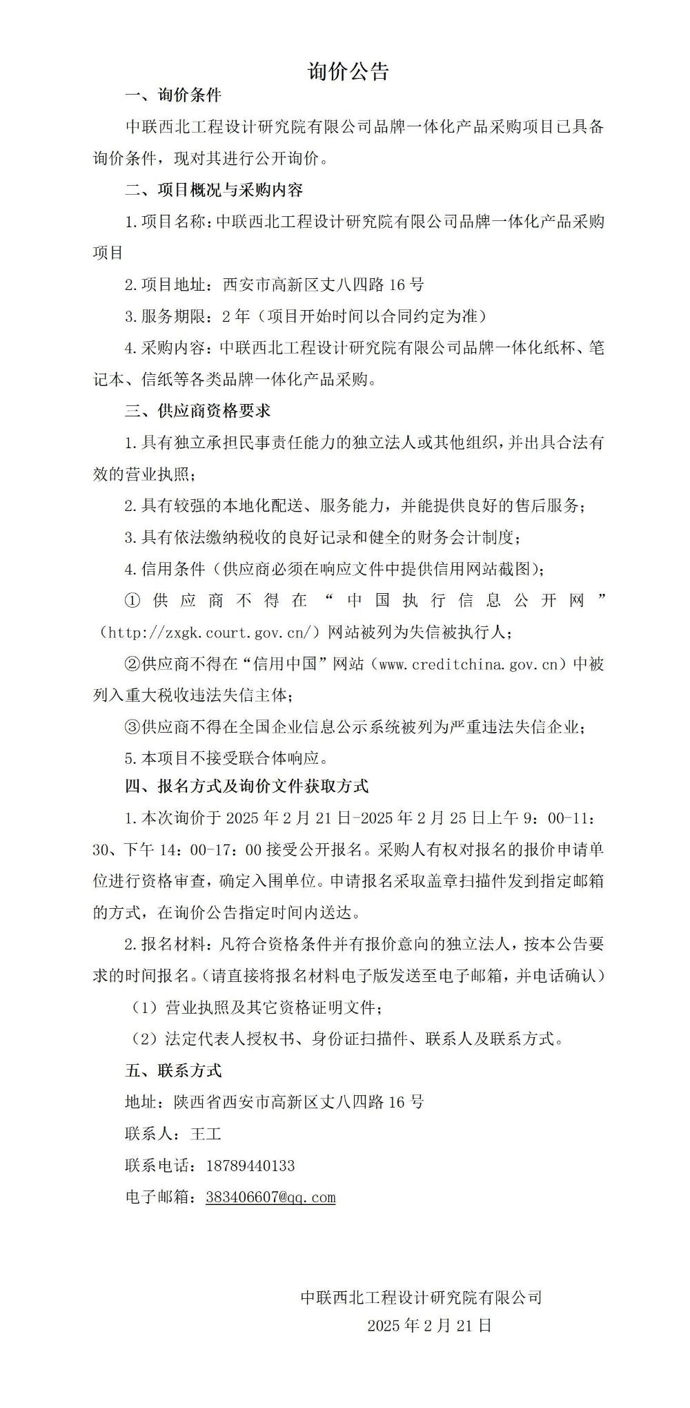 中联西北工程设计研究院有限公司办公用品采购项目询价公告