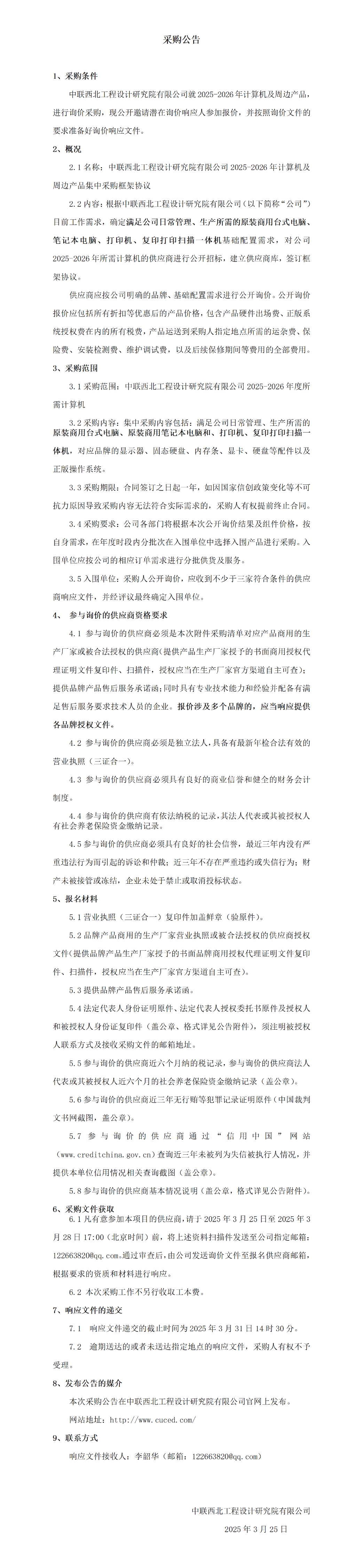 中联西北院2025-2026年电脑及周边产品集中采购公告