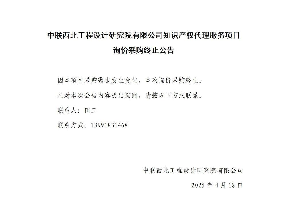 中联西北工程设计研究院有限公司知识产权代理服务项目询价采购终止公告
