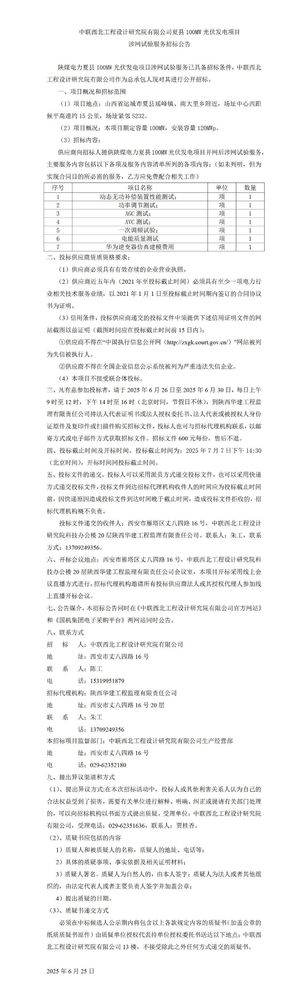 中联西北工程设计研究院有限公司夏县100MW光伏发电项目涉网试验服务招标公告