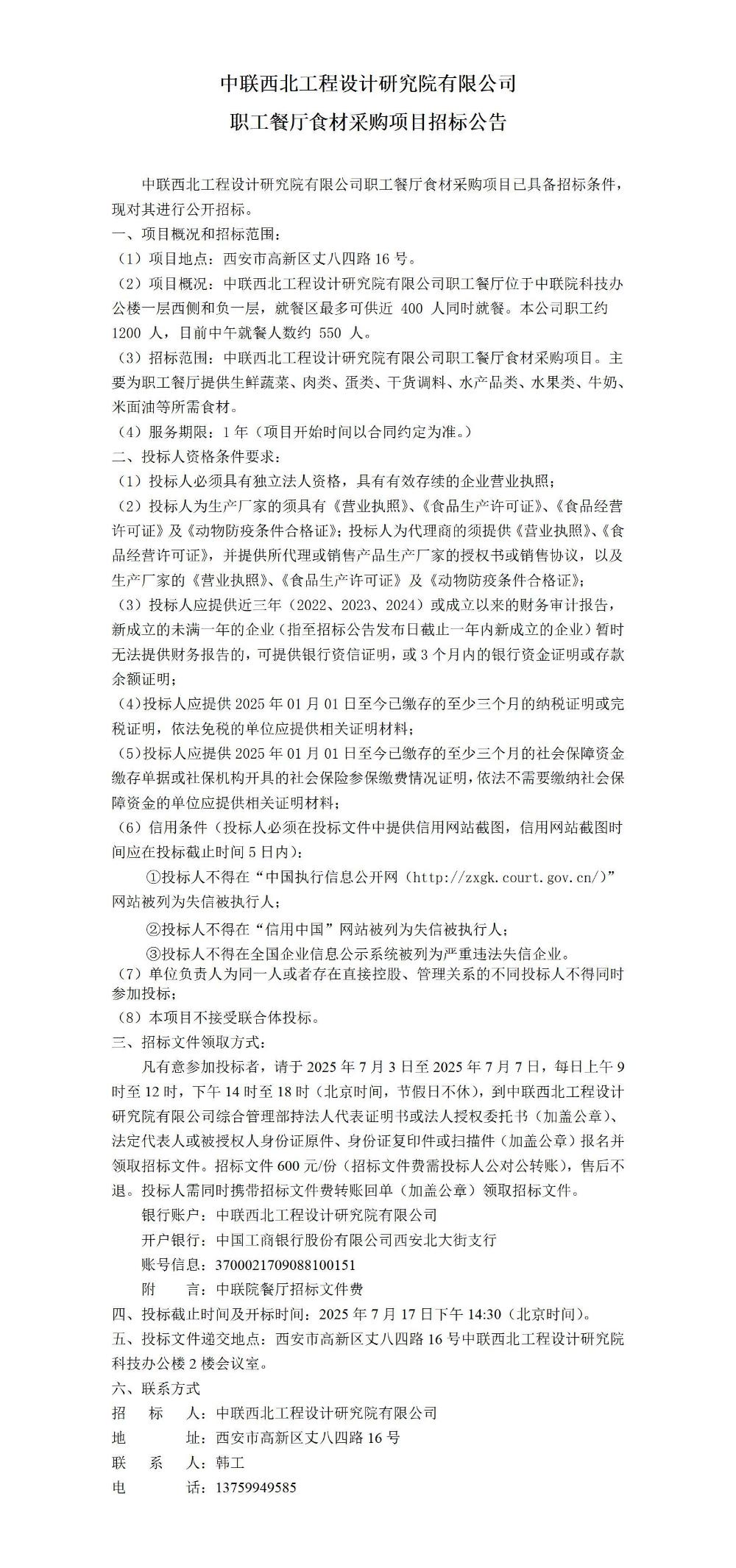 中联西北工程设计研究院有限公司职工餐厅食材采购项目招标公告