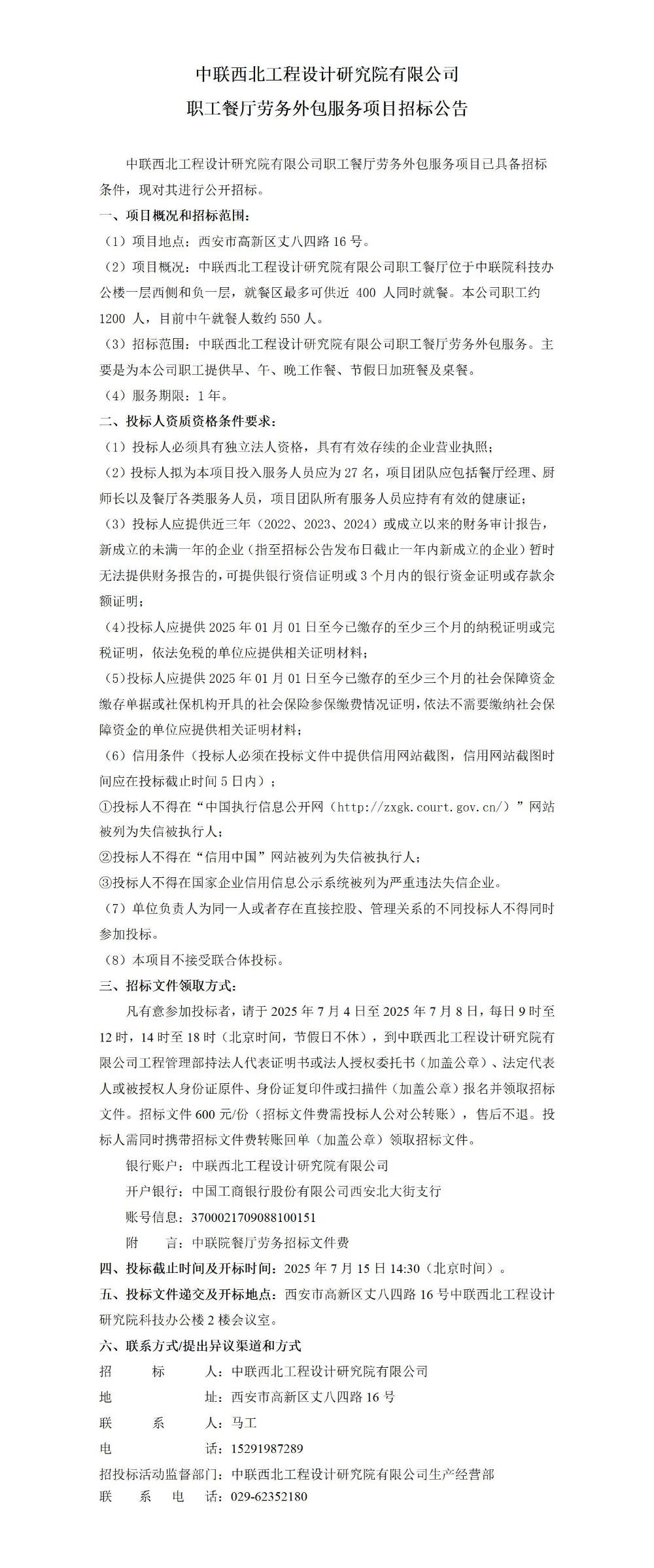 中联西北工程设计研究院有限公司职工餐厅劳务外包服务项目招标公告