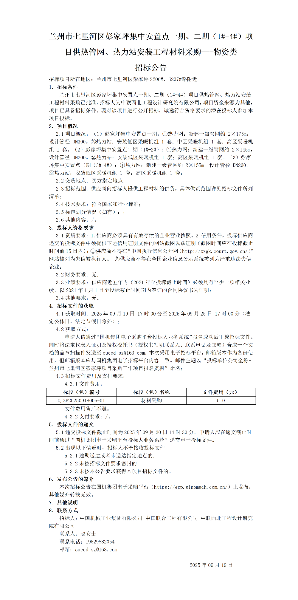 兰州市七里河区彭家坪集中安置点一期、二期(1#-4#)项目供热管网、热力站安装工程材料采购---物资类招标公告