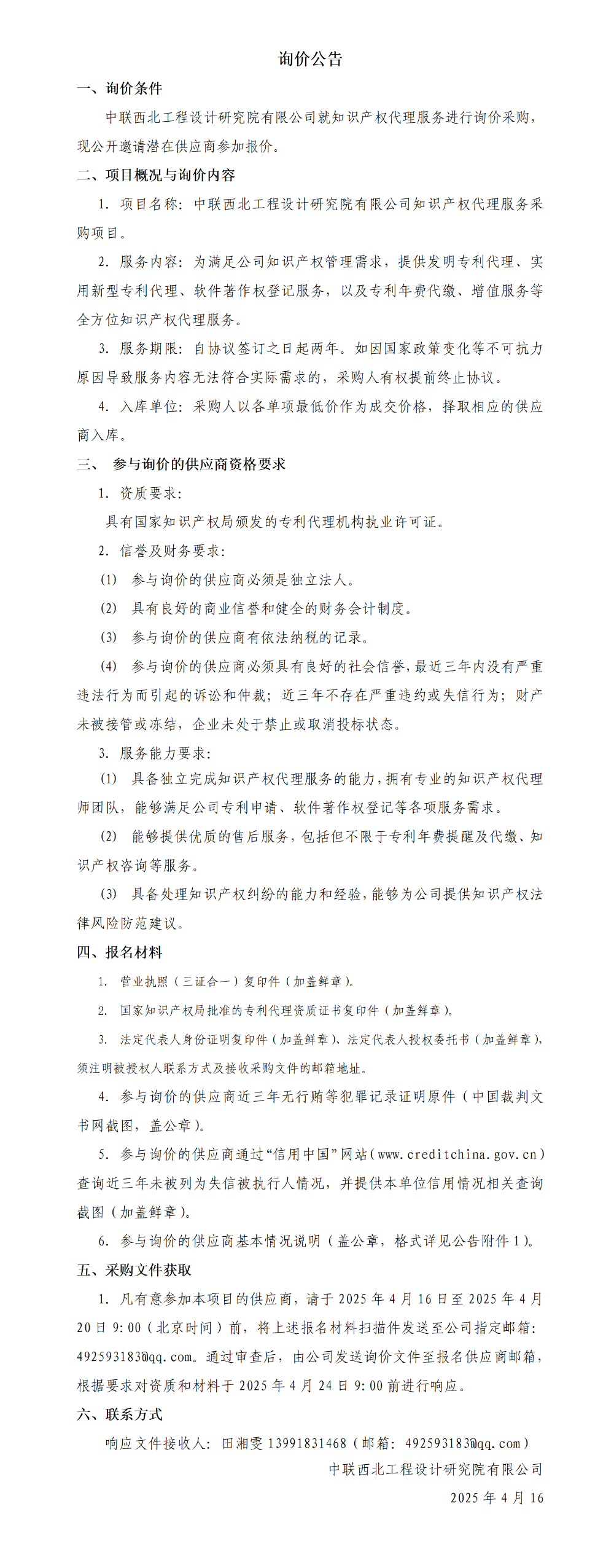 中联西北工程设计研究院有限公司职工餐厅劳务外包服务项目招标公告
