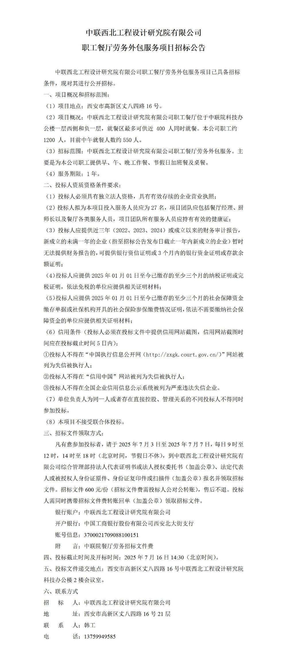 中联西北工程设计研究院有限公司职工餐厅劳务外包服务项目招标公告
