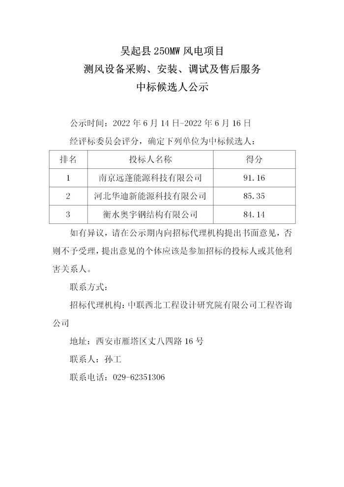 吴起县250MW风电项目测风设备采购、安装、调试及售后服务中标候选人公示