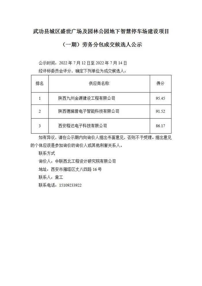 武功县城区盛世广场及园林公园地下智慧停车场建设项目(一期)劳务分包成交候选人公示