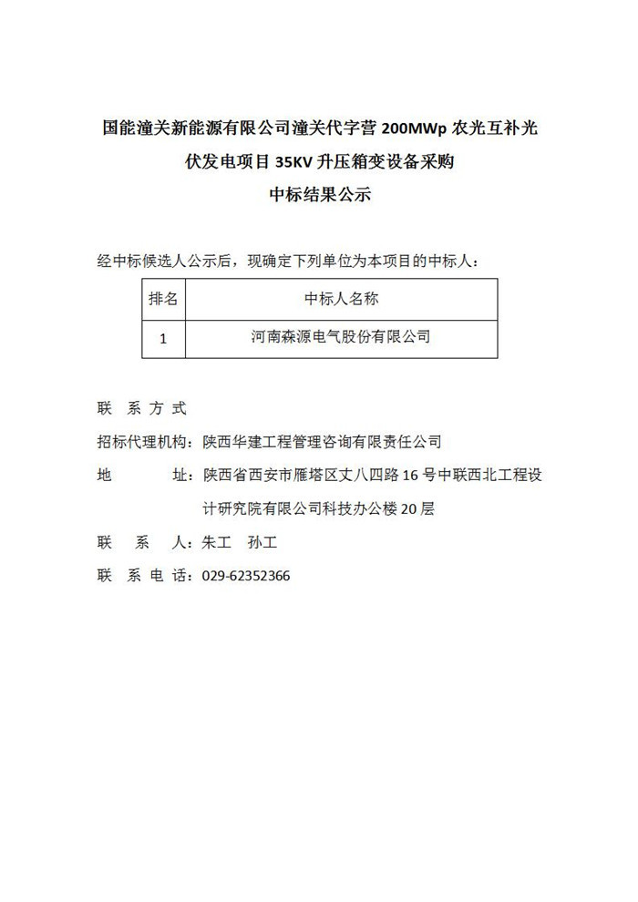 国能潼关新能源有限公司潼关代字营200MWp农光互补光伏发电项目35kv升压箱变设备采购中标结果公示