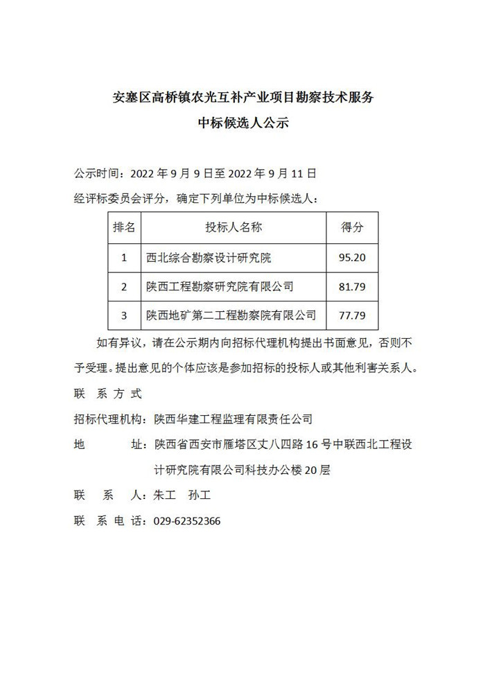 安塞区高桥镇农光互补产业项目勘察技术服务中标候选人公示