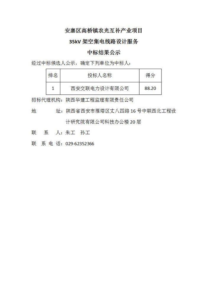 安塞区高桥镇农光互补产业项目35kV架空集电线路设计服务中标结果公示