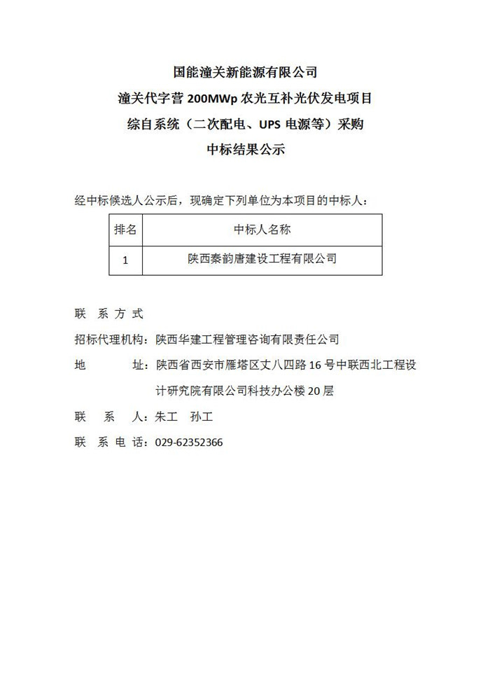 国能潼关新能源有限公司潼关代字营200MWp农光互补光伏发电项目综自系统(二次配电、UPS电源等)采购中标结果公示