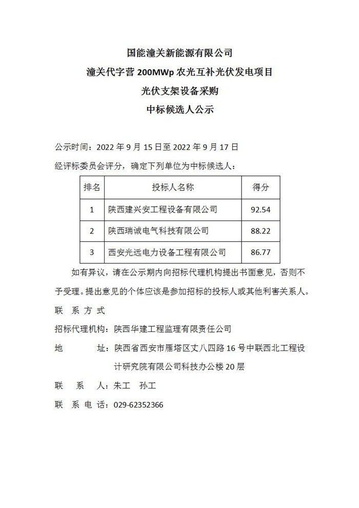 国能潼关新能源有限公司潼关代字营200MWp农光互补光伏发电项目光伏支架设备采购中标候选人公示