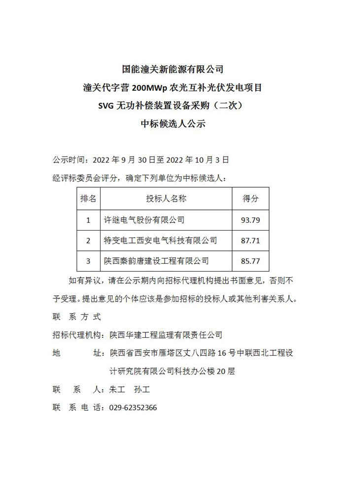 国能潼关新能源有限公司潼关代字营200MWp农光互补光伏发电项目SVG无功补偿装置设备采购(二次)中标候选人公示