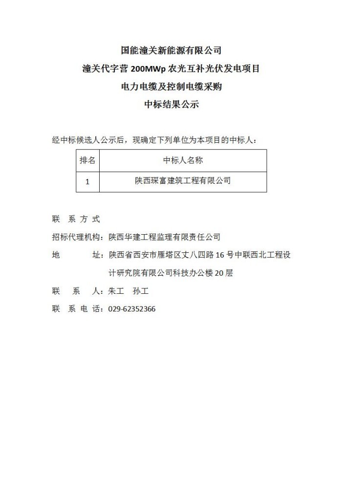 国能潼关新能源有限公司潼关代字营200MWp农光互补光伏发电项目电力电缆及控制电缆采购中标结果公示