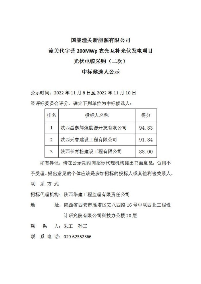 国能潼关新能源有限公司潼关代字营200MWp农光互补光伏发电项目光伏电缆采购(二次)中标候选人公示