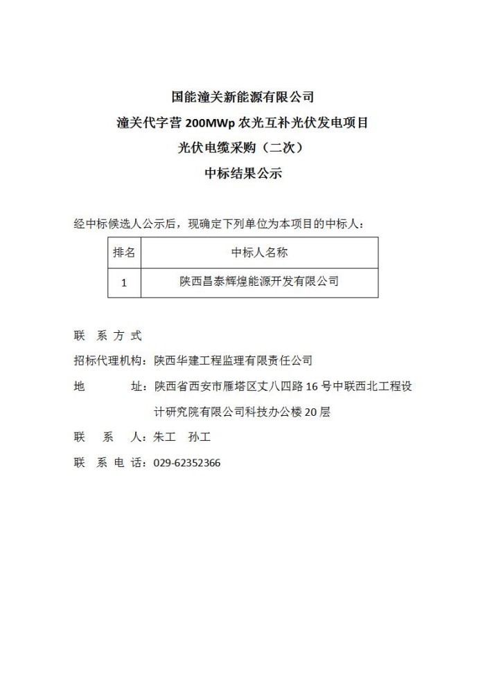 国能潼关新能源有限公司潼关代字营200MWp农光互补光伏发电项目光伏电缆采购(二次)中标结果