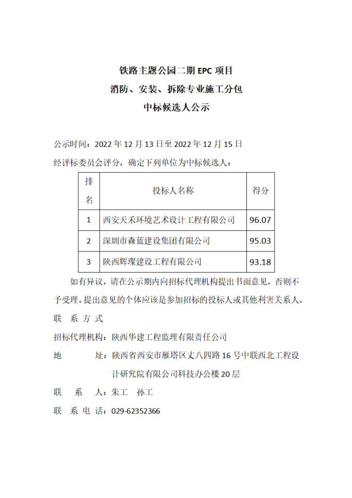 铁路主题公园二期EPC项目消防、安装、拆除专业施工分包中标候选人公示