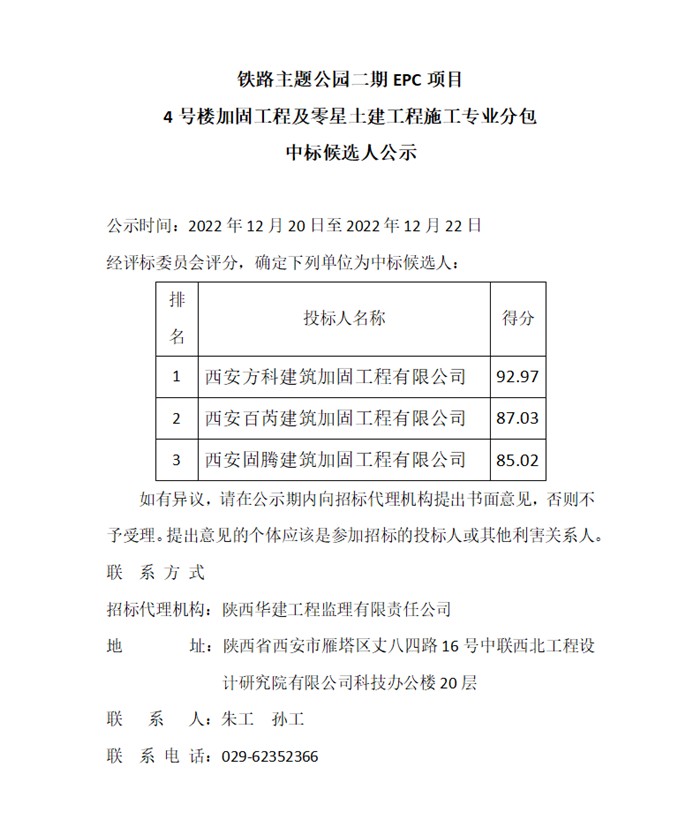 铁路主题公园二期EPC项目4号楼加固工程及零星土建工程施工专业分包中标候选人公示