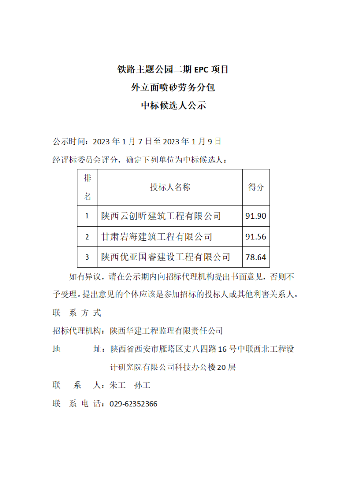 铁路主题公园二期EPC项目外立面喷砂劳务分包中标候选人公示