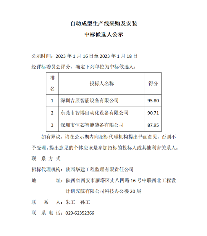 自动成型生产线采购及安装中标候选人公示