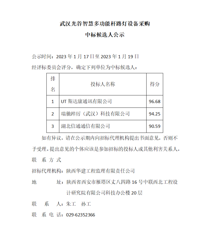 武汉光谷智慧多功能杆路灯设备采购中标候选人公示
