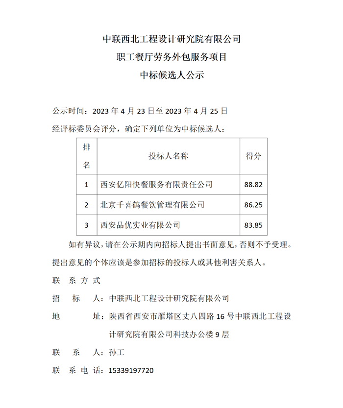 中联西北工程设计研究院有限公司职工餐厅劳务外包服务项目中标候选人公示