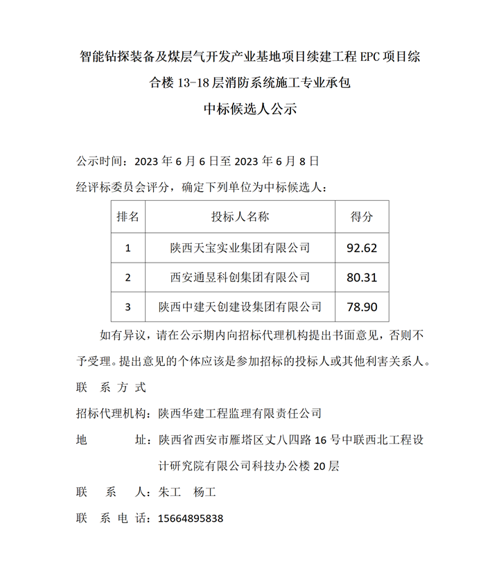 智能钻探装备及煤层气开发产业基地项目续建工程EPC项目综合楼13-18层消防系统施工专业承包中标候选人公示