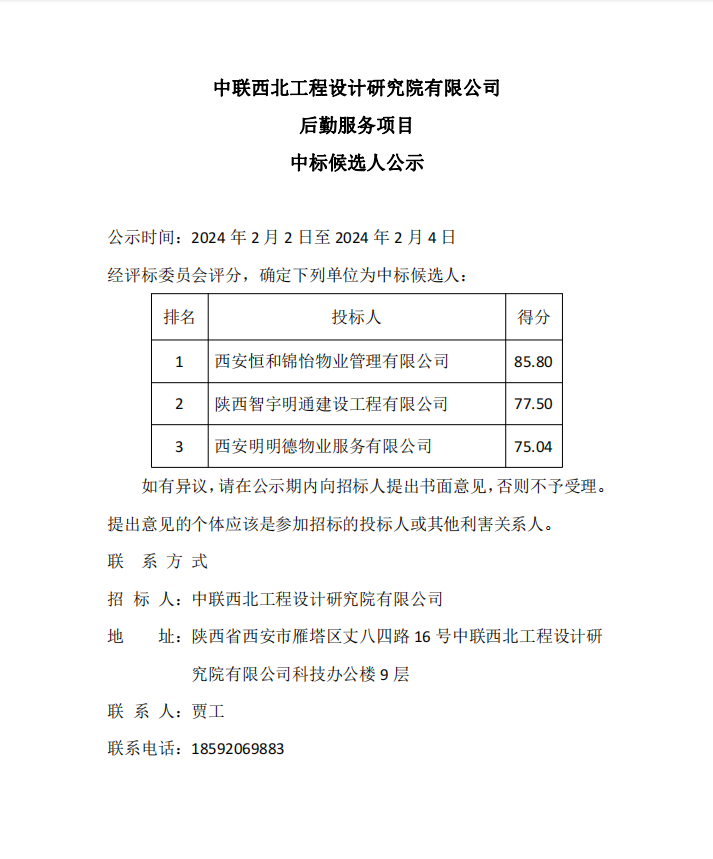 中联西北工程设计研究院有限公司后勤服务项目中标候选人公示