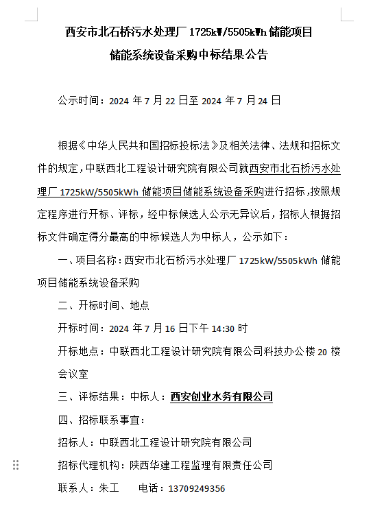西安市北石桥污水处理厂1725kW/5505kWh储能项目储能系统设备采购中标结果公告