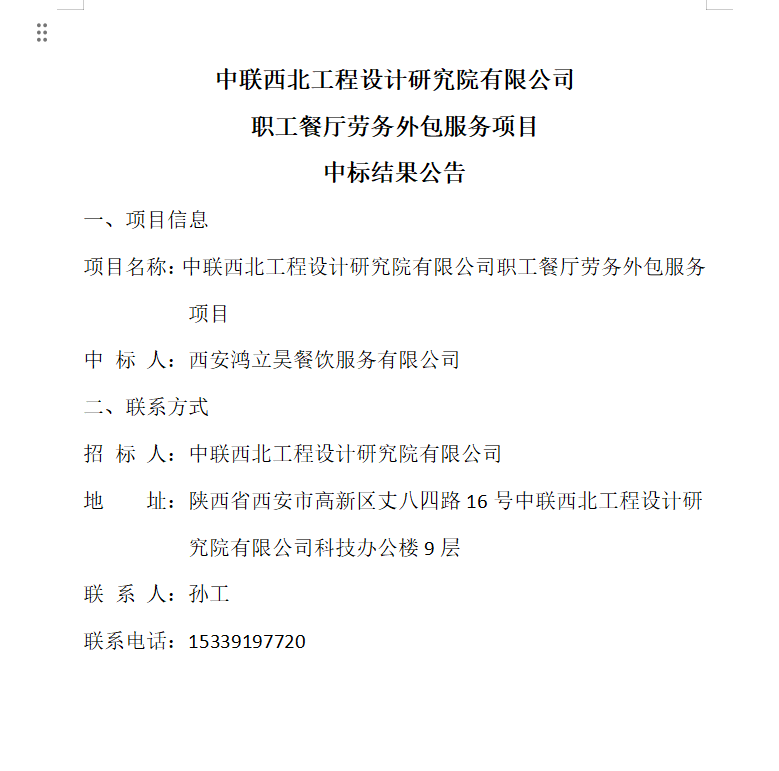 中联西北工程设计研究院有限公司职工餐厅劳务外包服务项目中标结果公告